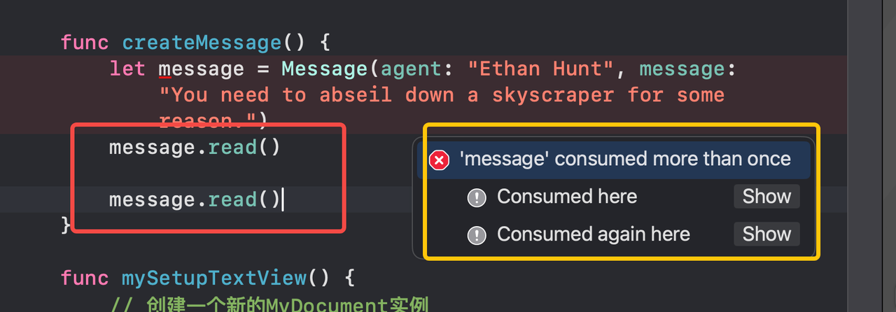 In that code, the compiler enforces that message.read() can only ever be called once, because it consumes the object.