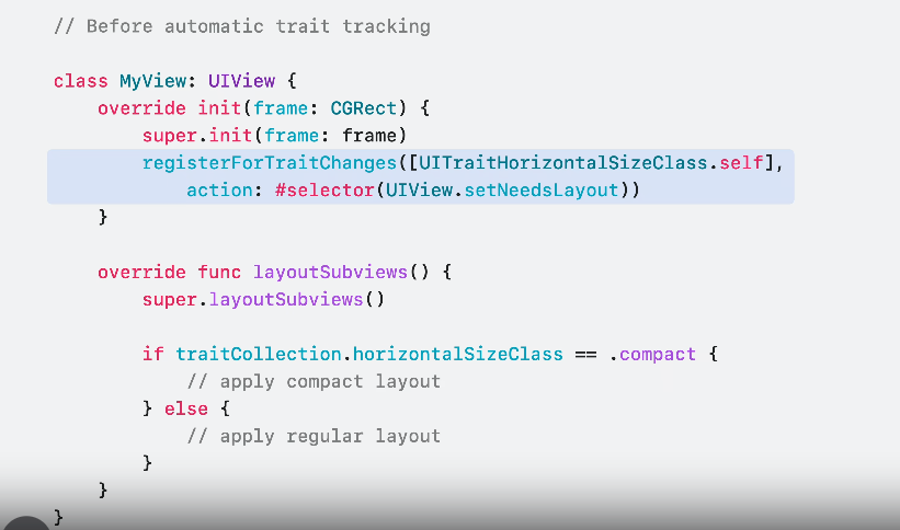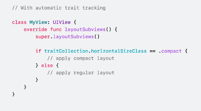 Leverage automatic trait usage tracking inside key update methods such as layoutSubviews(), eliminating the need for manual trait change registration and invalidation.